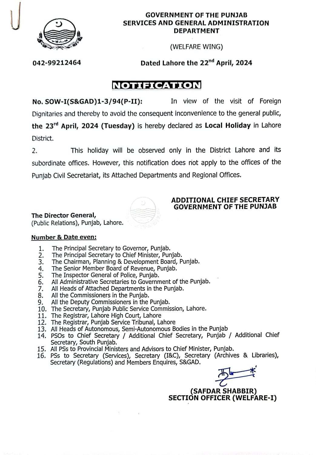 جبکہ سیکریٹریٹ اور دیگر دفاتر کھلے رہیں گے۔ یاد رہے کہ اس سے قبل کراچی، راولپنڈی اور اسلام آباد میں بھی تعطیل کا اعلان کیا گیا تھا۔