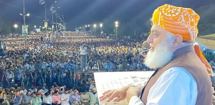مولانا فضل الرحمان نے کہا کہ ملک میں حکمرانی ہوگی تو صرف آئین کے مطابق ہوگی، لوگ سمجھتے ہیں ہم تھک جائیں گے لیکن ہم جہاں پر بھی جلسے میں گئے انسانوں کا سمندر نظر آیا۔