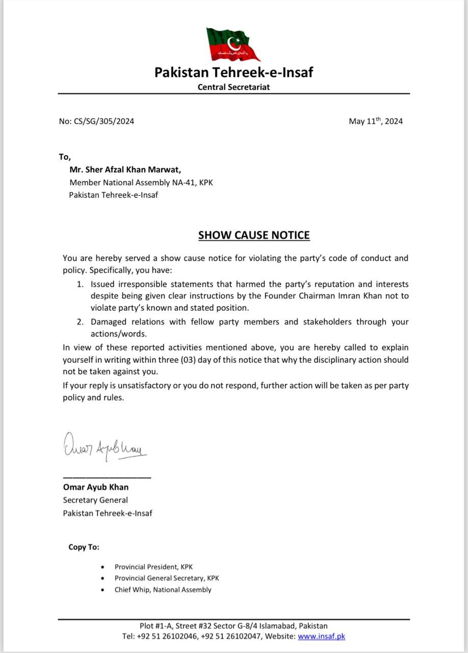 پی ٹی آئی کے رہنما عمر ایوب کی جانب سے شیر افضل مروت کو شوکاز نوٹس جاری کیا گیا ہے۔