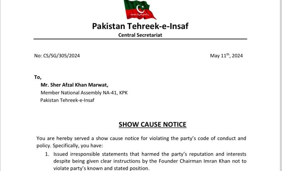 پاکستان تحریک انصاف نے شیر افضل مروت کو شوکاز نوٹس جاری کر دیا۔