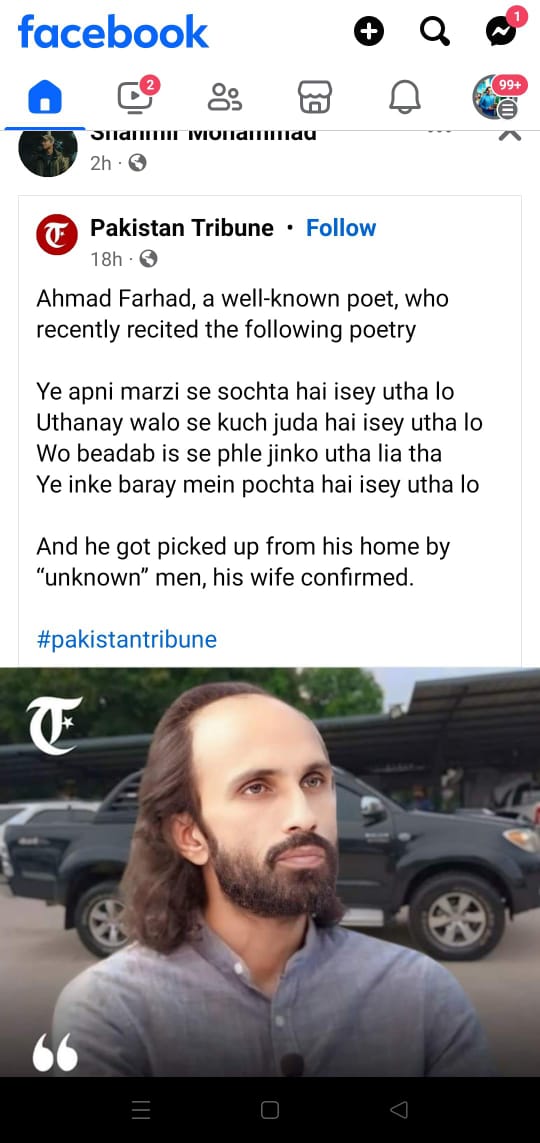سماجی رابطے کی ویب سائٹ پر ایک آزاد صحافتی پلیٹ فارم ” پاکستان ٹریبیون” کی طرف سے ایک احمد فرحاد نامی شاعر کی تصویر کو شیئر کیا گیا ۔