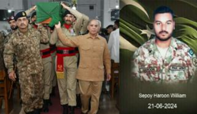 آئی ایس پی آر کے مطابق وزیراعظم شہباز شریف، آرمی چیف اور وزیرِ دفاع نے بھی سپاہی ہارون ولیم کی تدفین کی تقریب میں شرکت کی.
