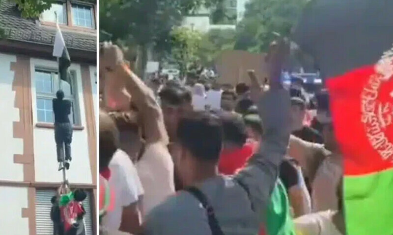 فرینکفرٹ میں موجود پاکستان قونصلیٹ جنرل کی عمارت کے باہر افغانیوں نے دھاوا بول دیا، اس دوران افغانی شہریوں نے پاکستانی پرچم کی بےحرمتی بھی کی۔