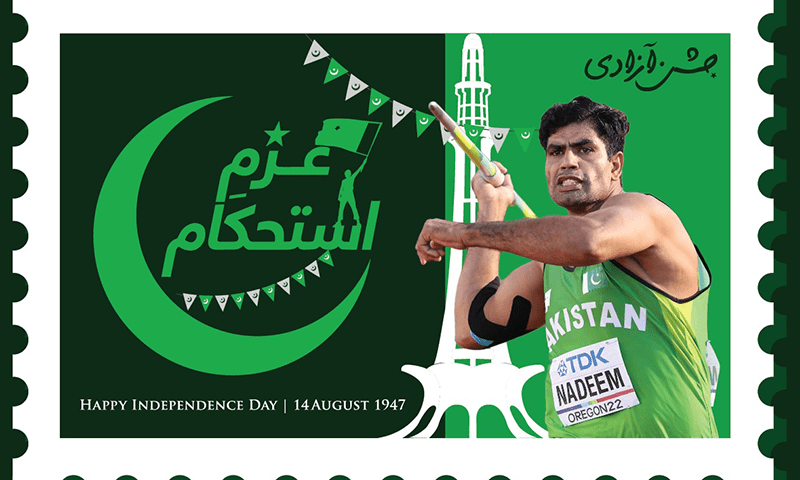 ملک کے 77ویں یوم آزادی کے موقع پر جاری کیے گئے ڈاک ٹکٹ پر ارشد ندیم کی تصویر آویزاں