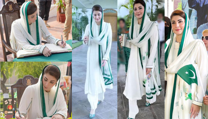 اس موقع پر مریم نواز نے سفید لمبی قمیص کے ساتھ ٹراؤزر زیب تن کیا جبکہ اپنے خاص انداز میں سفید دوپٹہ سر سے اوڑھا جس کے بارڈر پر سبز پٹیاں دیکھی جاسکتی ہیں۔
