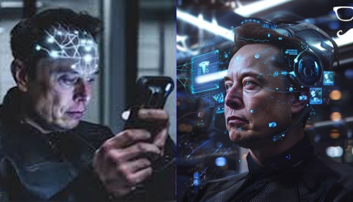 مذکورہ تصویر میں ایلون مسک کے ہاتھ میں فون ہے، جبکہ ان کے ماتھے پر اعصابی نیٹ ورک جیسا ڈیزائن دکھایا گیا ہے اور ایسا لگتا ہے کہ یہ AI کا استعمال کرتے ہوئے تیار کیا گیا ہے