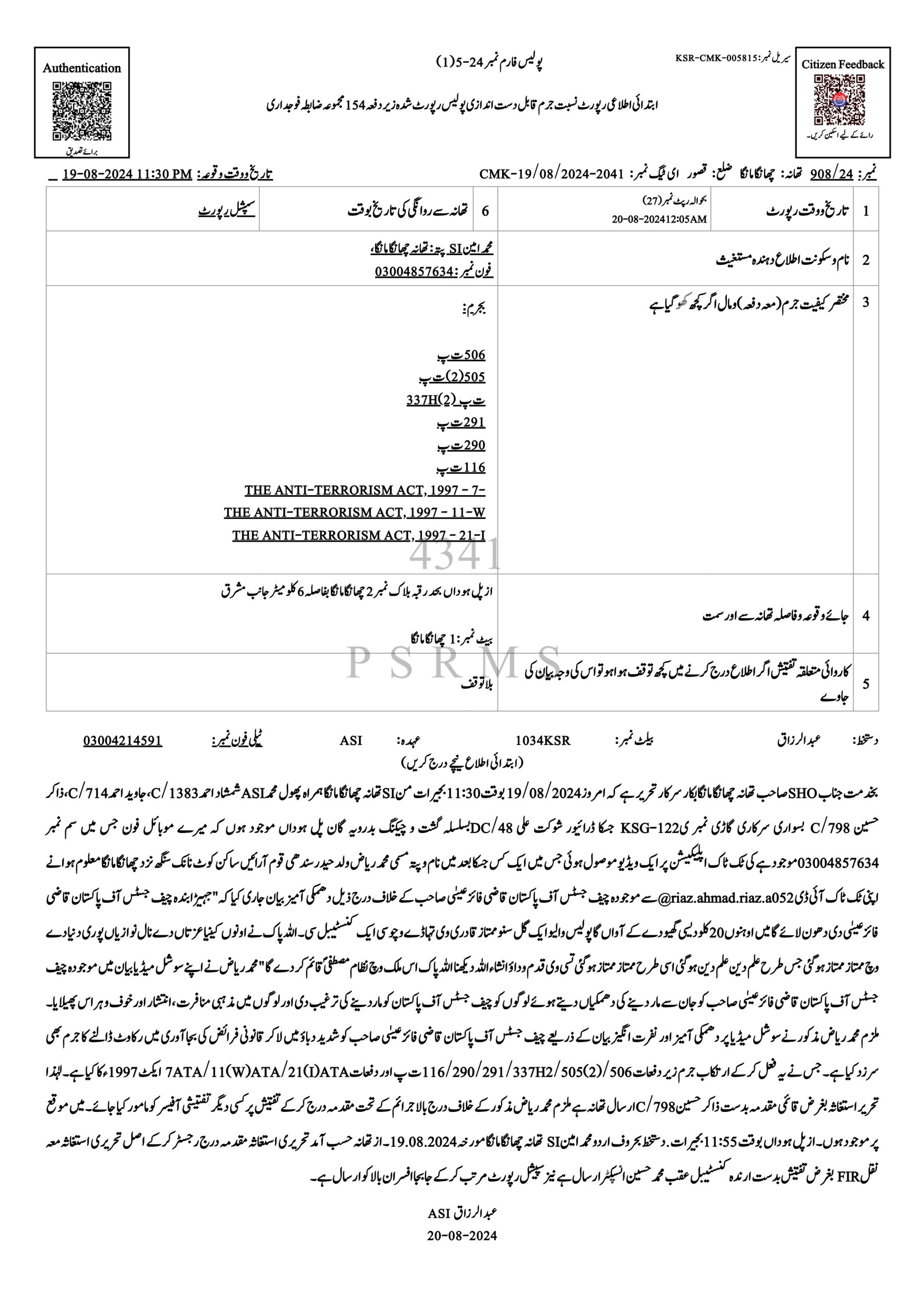 تھانہ چھانگا مانگا کی حدود میں میں چیف جسٹس آف پاکستان کے خلاف سوشل میڈیا پر جان سے مارنے کی دھمکی آمیز ویڈیو بیان جاری کرنے پر ملزم کے خلاف مقدمہ درج