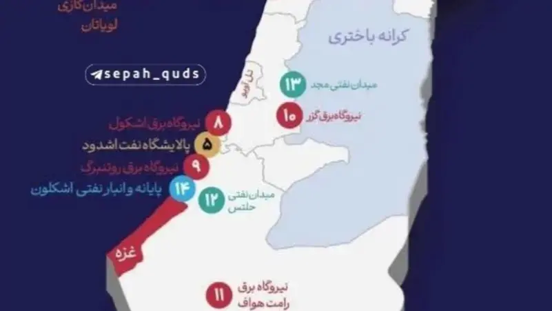 یہ نقشہ ٹیلی گرام پر پھیلایا گیا ہے۔ نقشہ میں کئی آئل پوائنٹس اور گیس فیلڈز دکھائے گئے ہیں جو ایرانی افواج کے دائرہ کار میں آتے ہیں۔ نقشے میں 14 مقامات دکھائے گئے ہیں جن کی تفصیل درج ہے۔