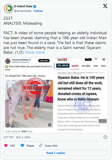سوشل میڈیا پر ایک وائرل ویڈیو میں دعویٰ کیا گیا ہے کہ ایک 188 سالہ شخص کو کے غار میں پایا گیا ہے، لیکن حقائق کی جانچ کرنے والوں نے انکشاف کیا ہے کہ وہ دراصل مدھیہ پردیش کا ایک 110 سالہ بزرگ ہے۔