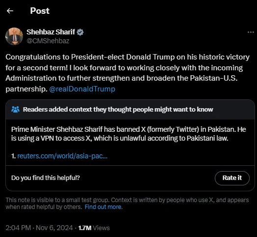 وزیر اعظم شہباز شریف نے ڈونلڈ ٹرمپ کو دوبارہ امریکی صدر بننے پر مبارک باد دینے کے لیے ایکس پلٹ فارم پر پیغام جاری کیا تو ایکس نے کمیونٹی نوٹ لگا دیا۔