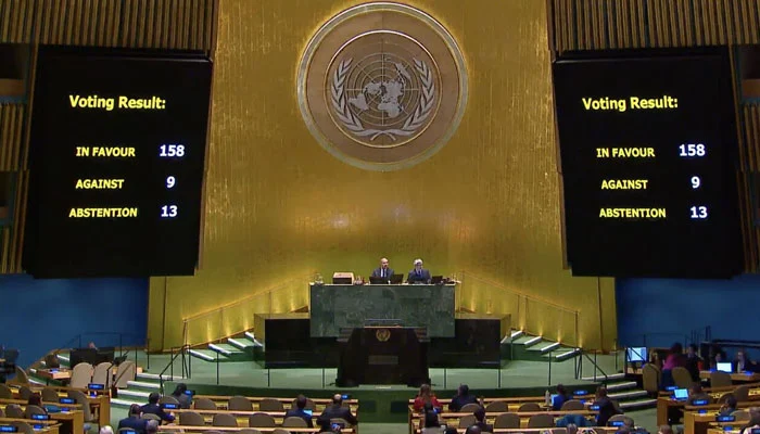 امریکا اسرائیل اور دیگر 7 ملکوں نے قرارداد کے خلاف ووٹ دیا، 13 غیرحاضر رہے۔