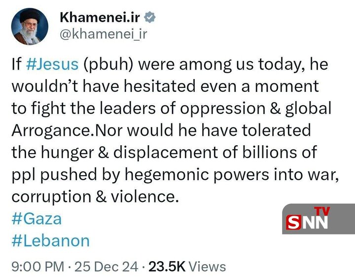 ایکس پر ایک بیان میں انہوں نے کہا ہے کہ آج عالمی طاقتوں نے جنگوں کے ذریعے اربوں لوگوں کو بھوک میں مبتلا کردیا اور ہجرت کرنے پر مجبور کردیا۔ حضرت عیسی علیہ السلام ان حالات کو برداشت نہیں کرتے۔