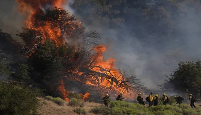طوفانی ہواؤں کے باعث 2 گھنٹوں میں 5 ہزارایکڑ رقبہ آگ کی لپیٹ میں آگیا۔لاس اینجلس کاؤنٹی فائر ڈپارٹمنٹ اور اینجلس نیشنل فارسٹ کا عملہ آگ بجھانے میں مصروف ہے۔
