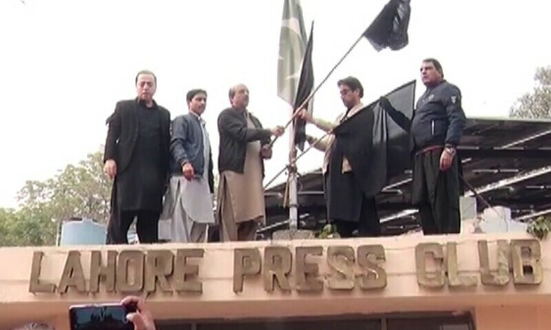 لاہور پریس کلب میں بھی صحافیوں کی بڑی تعداد نے احتجاجی مظاہرہ کیا، پی ایف یو جے کے جنرل سیکریٹری اور صدر پریس کلب ارشد انصاری نے صحافیوں کے ساتھ مل کر پریس کلب کی عمارت پر سیاہ پرچم لہرایا۔
