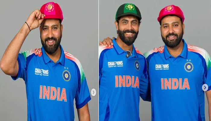 بھارتی کرکٹ ٹیم کے فوٹو شوٹ کی تصاویر سوشل میڈیا پر وائرل ہو رہی ہیں، جن میں کپتان روہت شرما، رویندرا جدیجا، ہاردک پانڈیا اور ارشدیپ سنگھ کو نئی جرسی زیب تن کیے دیکھا گیا ہے، لیکن جرسی پر موجود ٹورنامنٹ کے لوگو کے ساتھ پاکستان کے نام نے سب کی توجہ سمیٹ لی ہے