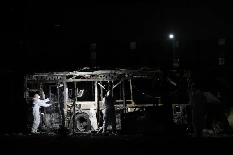 سوشل میڈیا پر موجود فوٹیج میں کم از کم ایک بس کو پارکنگ لاٹ میں آگ لگے دیکھا جا سکتا ہے۔