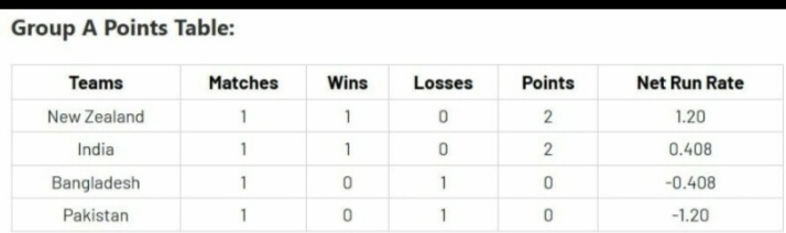 بھارتی ٹیم صرف نیٹ رن ریٹ کے لحاظ سے نیوزی لینڈ سے پیچھے ہے جس نے بدھ کو میزبان اور دفاعی چیمپئن پاکستان کے خلاف 60 رنز کی بڑی فتح حاصل کی تھی۔