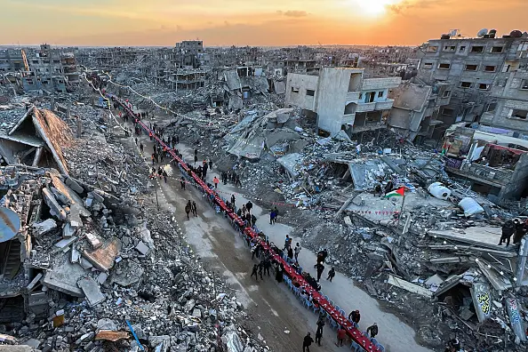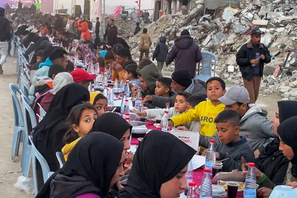 غزہ سے سامنے آنے والی ان تصاویر میں لوگوں کی ایک بڑی تعداد تباہ شُدہ عمارتوں کی بیچوں بیچ دسترخوان لگائے دیکھا جا سکتا ہے۔
