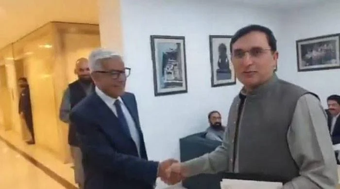 خواجہ آصف اور بیرسٹر گوہر کی ملاقات، مصافحہ اور قہقے