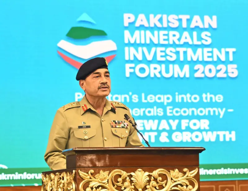 پاکستان کے آرمی جنرل چیف عاصم منیر نے کہا ہے کہ پاکستانی عوام کے پیروں کے نیچے وسیع معدنی ذخائر، ہاتھوں میں مہارت اور شفاف معدنی پالیسی کے ہوتے ہوئے مایوسی اور بے عملی کی کوئی گنجائش نہیں اور پختہ یقین ہے کہ پاکستان عالمی معدنی معیشت میں ایک رہنما کے طور پر ابھرنے کے لیے تیار ہے۔