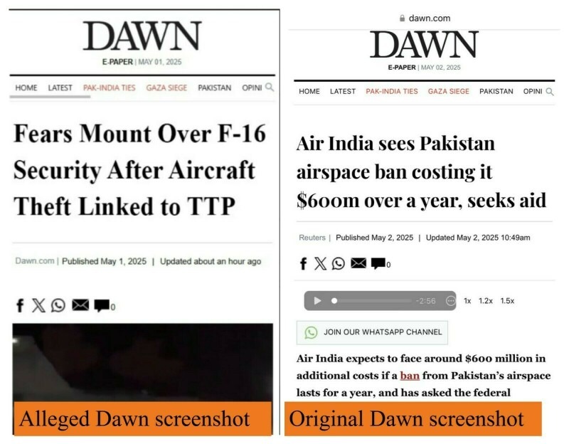 سوشل میڈیا پر جمعرات سے متعدد بھارتی صارفین نے ایک جعلی اسکرین شاٹ شیئر کر رہے ہیں جس میں دعویٰ کیا گیا کہ پاکستان ایئر فورس (پی اے ایف) کا ایف-16 جنگی طیارہ تحریک طالبان پاکستان (ٹی ٹی پی) نے چرالیا ہے، اور دعویٰ کیا گیا کہ یہ خبر ”ڈان ڈاٹ کام“ نے شائع کی۔ تاہم، ڈان نیوز نے ترددی کی کہ اس نے ایسی کوئی خبر شائع نہیں کی۔