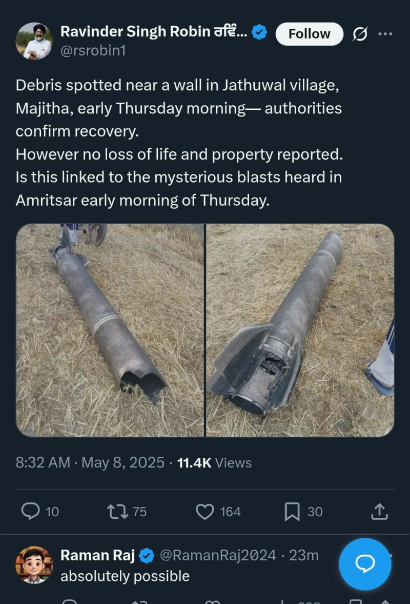 امرتسر دیہی کے سینئر سپرنٹنڈنٹ آف پولیس منیندر سنگھ کے مطابق علاقے میں کسی دھماکے یا زمین پر میزائل ٹکرانے کے شواہد نہیں ملے، تاہم میزائل جیسا ایک دھاتی ٹکڑا ضرور ملا ہے جسے فرانزک ٹیم نے اپنی تحویل میں لے کر تحقیقات شروع کر دی ہیں۔