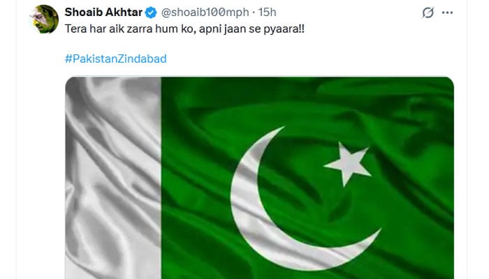 علاوہ ازیں سابق فاسٹ بولر شعیب اختر نے سوشل میڈیا پر اکاؤنٹ پر قومی پرچم کی تصویر پوسٹ کر کے لکھا کہ تیرا ہر ایک ذرہ ہم کو اپنی جان سے پیارا
