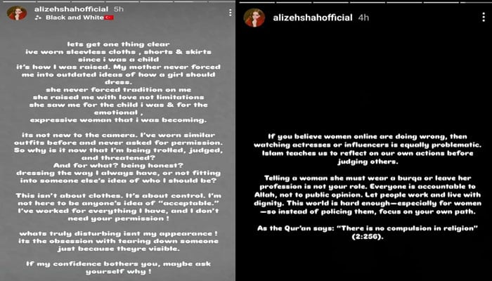 اداکارہ نے انسٹاگرام پر جاری بیان میں کہا کہ میں بچپن سے بغیر آستینوں والے کپڑے، شارٹس اور اسکرٹس پہنتی آئی ہوں، میری والدہ نے مجھے کبھی مجبور نہیں کیا کہ میں مخصوص انداز میں لباس پہنوں یا پرانی روایات کا پابند رہوں، انہوں نے مجھے محبت دی، حدود نہیں، یہ میری شخصیت کا حصہ ہے اور کوئی نیا طرزِ عمل نہیں ہے۔