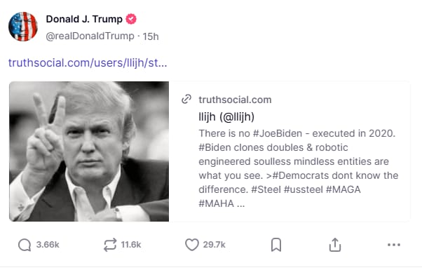 ٹرمپ نے اس پوسٹ کو بغیر کسی تبصرے کے شیئر کیا، جو ایک نایاب اقدام سمجھا جا رہا ہے کیونکہ اس میں ایک انتہائی سازشی نظریے کو فروغ دیا گیا ہے۔ پوسٹ کے اختتام پر ڈیموکریٹس کو طنزیہ انداز میں نشانہ بھی بنایا گیا