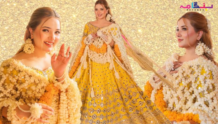 مایوں کی تقریب میں انہوں نے زرد رنگ کی خوبصورت پشواس زیب تن کی اور اس سوٹ کی خاص بات اس پر اوڑھا گیا خاص طور پر تیار پھولوں کادوپٹہ ہے۔
