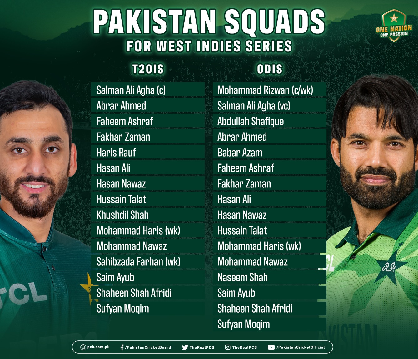 ویسٹ انڈیز کے خلاف ون ڈے اور ٹی ٹوئنٹی انٹرنیشنل سیریز کیلئے پاکستان سکواڈ کا اعلان۔