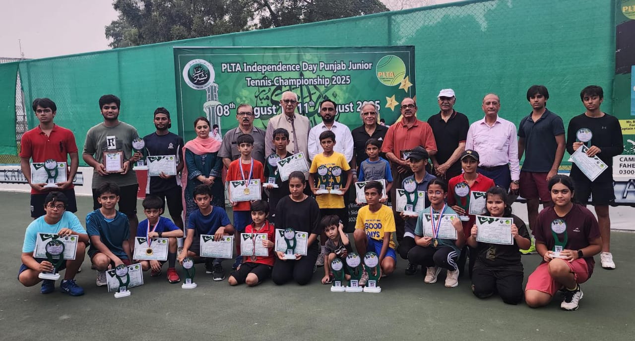 لاہور: علی ایمبرائیڈری ملز کے اُبھرتے ہوئے اسٹارز اسد زمان اور بسمل ضیاء، جبکہ فاطمہ گروپ کے محمد معاذ اور محمد ایان نے یومِ آزادی پنجاب جونیئر ٹینس چیمپئن شپ 2025 میں شاندار کارکردگی کا مظاہرہ کرتے ہوئے مختلف کیٹیگریز میں ٹائٹلز اپنے نام کیے۔ یہ ایونٹ باغِ جناح لاہور میں واقع پنجاب ٹینس اکیڈمی میں اختتام پذیر ہوا۔