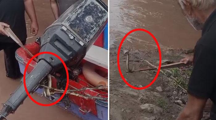 ریسکیو ٹیم کے اہلکاروں نے سانپ کو لائف بوٹ سے باہر نکال دیا جس پر دریا پر کھڑے لوگوں نے ریسکیو کی ٹیم کو شاباشی دی۔