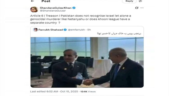 یہ دعویٰ تحریکِ انصاف کی رہنما شاندانہ گلزار خان نے کیا، جنہوں نے 15 اکتوبر کو اپنے ایکس (سابق ٹوئٹر) اکاؤنٹ پر ایک تصویر شیئر کی جس کے ساتھ انہوں نے آرٹیکل 6، غداری جیسے الفاظ استعمال کیے۔