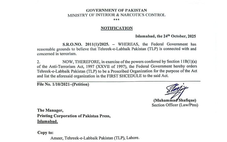 نوٹیفکیشن میں کہا گیا ہے کہ انسداد دہشت گردی ایکٹ 1997 کے مطابق ٹی ایل پی کو فرسٹ شیڈول کے تحت کالعدم جماعتوں کی فہرست میں شامل کر لیا گیا ہے۔