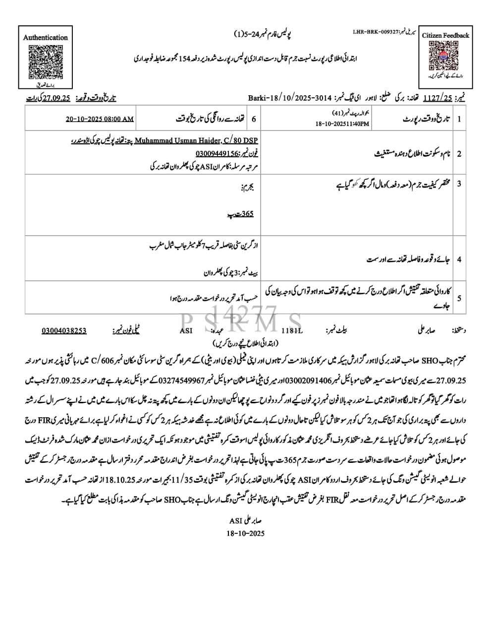 درج شدہ ایف آئی آر میں سائل عثمان حیدر نے گزارش کی کہ ان کہ بیوی اور بیٹی کے ہمراہ گرین سٹی سوسائٹی میں میں رہائش پذیر ہیں ۔