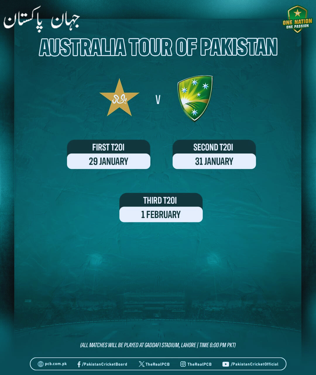 پی سی بی نے جنوری کے آخر میں آسٹریلیا کے دورۂ پاکستان کی تصدیق کر دی ہے، جس کے تحت دونوں ٹیموں کے درمیان تین ٹی ٹوئنٹی میچز کی سیریز کھیلی جائے گی۔ سیریز کے تمام میچز قذافی اسٹیڈیم لاہور میں ہوں گے اور اس کا آغاز 29 جنوری سے ہوگا، جبکہ دیگر میچز 31 جنوری اور یکم فروری کو کھیلے جائیں گے۔