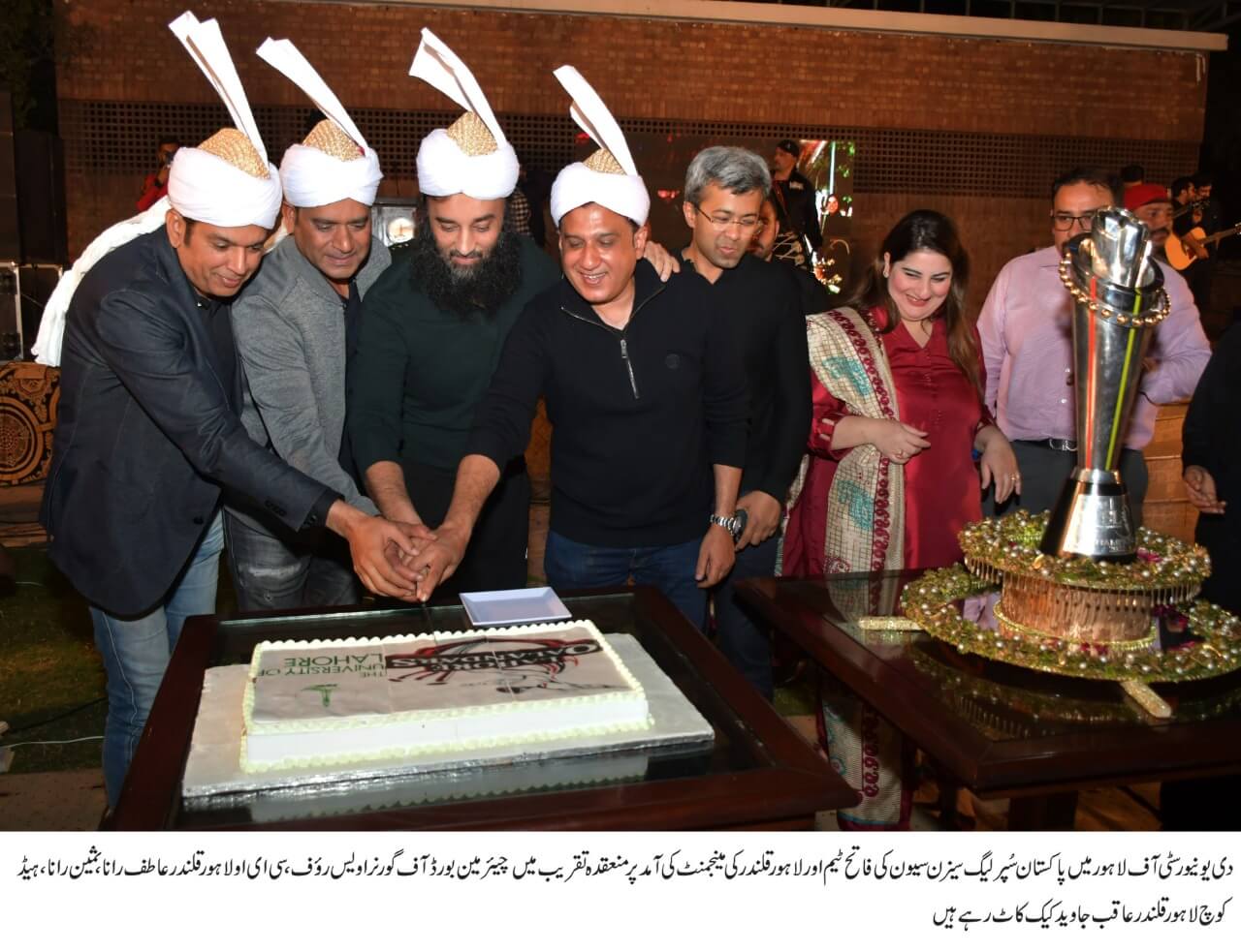 تقریب کے دوران لاہور قلندرز کی جیت کا جشن مناتے ہوئے کیک کاٹا گیا جبکہ یونیورسٹی آف لاہور کی قیادت کی جانب سے ٹیم، عہدیداران، فرنچائز مالک اور ہیڈ کوچ کو خصوصی طور پر مبارکباد پیش کی گئی۔