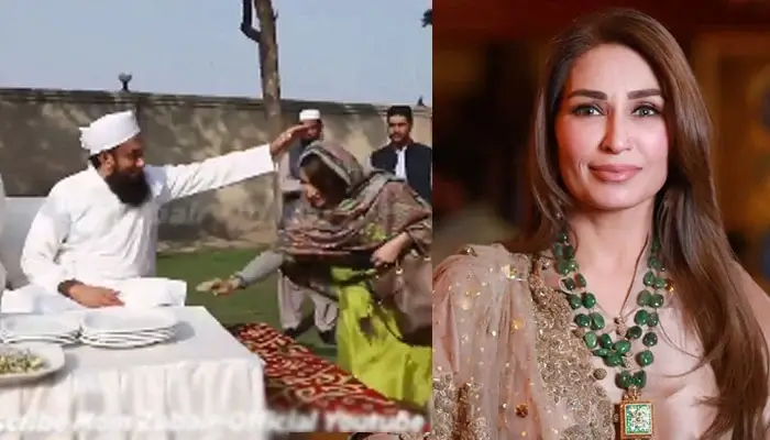 مولانا طارق جمیل کی جانب سے ریما خان سے کھانا پلیٹ میں نکالنے کا کہا گیا جس پر ریما خان کا پہلے مولانا طارق جمیل کو کھانا لینے کی درخواست کرتے ہوئے کہنا تھا کہ ’میرے تو ہاتھ کانپ رہے ہیں، آپ بسم اللّٰہ کریں۔‘