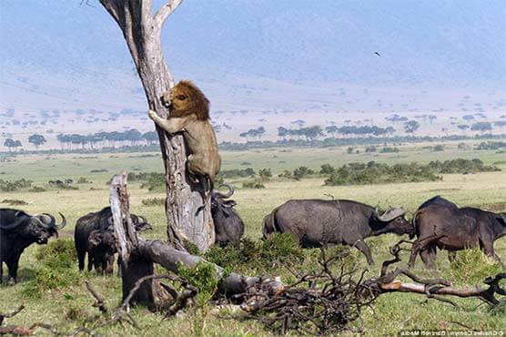ویڈیو میں دیکھا جاسکتا ہے کہ شیر بھینسوں کے ریوڑ کے سامنے بے بس نظر آرہا ہے اور ان سے بچنے کے لیے درخت سے چمٹا ہوا ہے۔