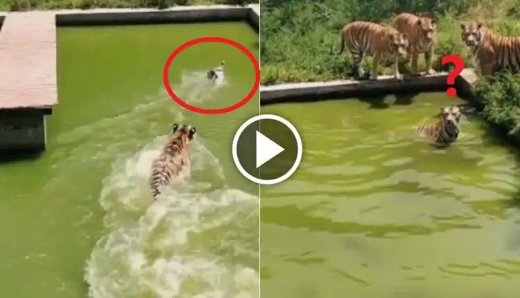 جیسے ہی تالاب سے باہر اور اندر موجود ٹائیگرز نے بطخ کو جھپٹنے کی کوشش کی، بطخ نے اچانک پانی میں ڈبکی ماری اور زیر آب غائب ہوگئی، جسے ٹائیگرز چاروں طرف بے بسی کے عالم میں دیکھتے رہے۔