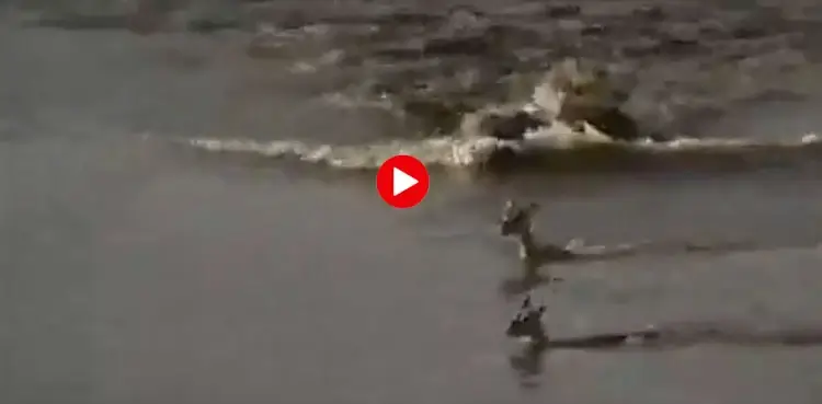 وائرل کلپ میں دکھایا گیا ہے کہ مگرمچھ ہرن کو دبوچ کر لے جاتا ہے اور بچہ آگے کی جانب نکل جاتا ہے۔
