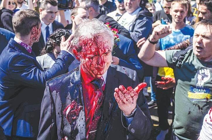 پولینڈ کے دارالحکومت وارسا میں روسی سفیر کے منہ پر یوکرین جنگ کے مخالف مظاہرین نے سرخ رنگ پھینک دیا۔
