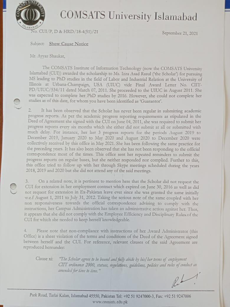 کامسیٹس یونیورسٹی کی جانب سے ازا اسد رسول کو لکھے گئے شوکاز نوٹس میں کہا گیاہے کہ آپ کو7 مارچ 2011 میں امریکہ کی University of Illinois at Urbana-Champaign USA(UIUC)) (کے لیے سکالرشپ ایوارڈ کیا گیاجبکہ آپ نے اس یونیورسٹی میں اگست 2011 میں حاضری دی۔