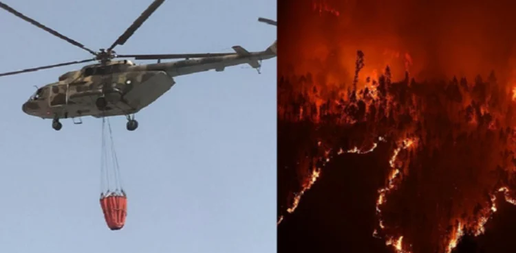 ایک ہیلی کاپٹر سے آگ پر پانی گرایا جارہا ہے، دوسرےہیلی کاپٹر سے فائر بالز اور کیمیکلز پھینکے جارہے ہیں۔