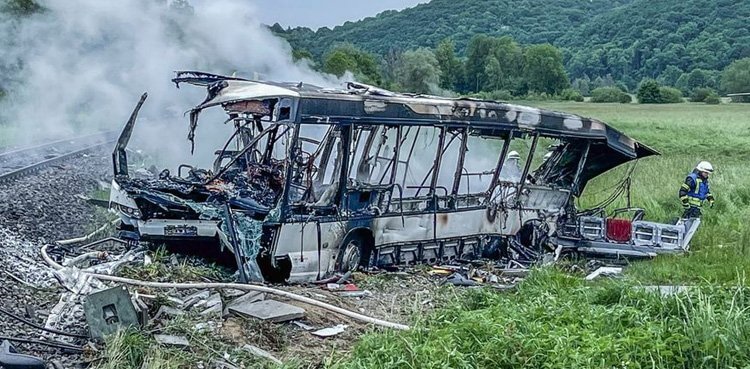 جرمنی میں ٹرین اور بس کی ٹکر کے نتیجے بس مکمل طور پر جل کر تباہ جبکہ ٹرین بھی پٹری سے اتر گئی۔ حادثے میں متعدد افراد شدید زخمی ہوگئے۔