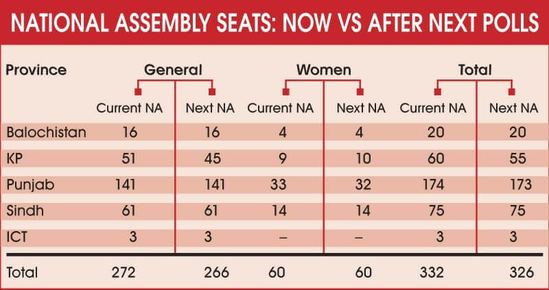 الیکشن کمیشن آف پاکستان (ای سی پی) کی ابتدائی حلقہ بندی رپورٹ کے مطابق ریٹائرڈ جنرل پرویز مشرف کے دورِ حکومت میں آبادی کے تناظر میں خیبر پختونخوا کے لیے 6 سیٹیں مختص کی گئی تھیں، جس کے نتیجے میں قومی اسمبلی کی نشستوں کی تعداد 276 سے کم ہوکر 266 رہ گئی تھی۔