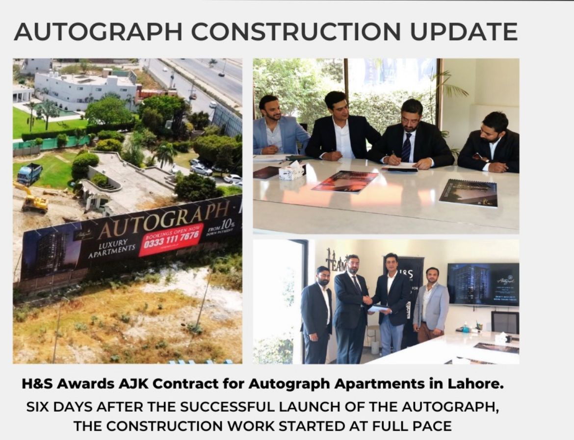 مورخہ 9 جون 2022 کو آٹو گراف کاسنگ بنیاد رکھنے کیلئے پروجیکٹ کی سائٹ پر ایک شاندار تقریب کا اہتمام کیا گیا ۔ اس افتتاحی تقریب کے ایک ہفتے کے اندر ہی آٹوگراف کی تعمیر کا آغاز کر دیا گیا ہے ۔ اس حوالے سے پائلنگ کے کاکام اور بیسمنٹ کی تعمیرات کا ٹھیکہ AJK کنسٹر کشن فر کو دیا گیا ہے ۔ AJKایک معروف تعمیراتی کمپنی ہے اور H&S اس کمپنی کو ورکنگ پارٹنر کے طور پر اپنی ٹیم کا حصہ بنانے کیلئے فخر محسوس کرتا ہے ۔