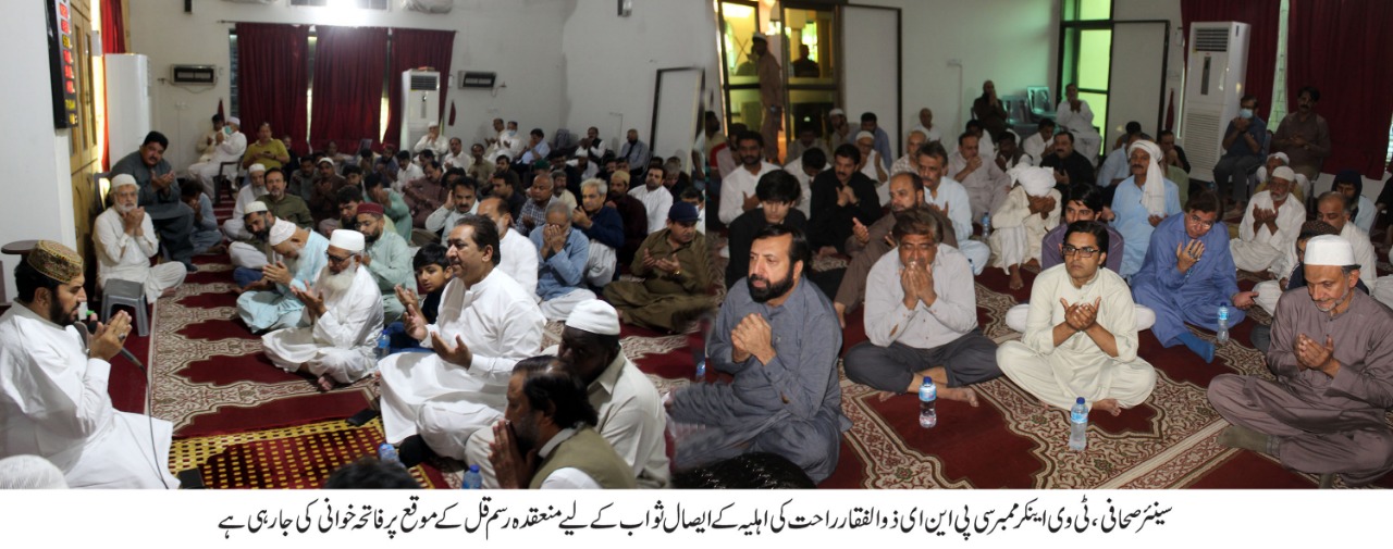 لاہور(خبرنگار) سنیئر صحافی، ٹی وی اینکراور سی پی این ای کے سنیئر ممبر ذوالفقار راحت کی اہلیہ کے ایصال ثواب کے لیے گذشتہ روز ان کی رہائش گاہ کے قریب جامع مسجد ڈبل ایکس بلاک فیز تھری ڈی ایچ اے لاہورمیں قرآن خوانی کا اہتمام کیاگیا۔