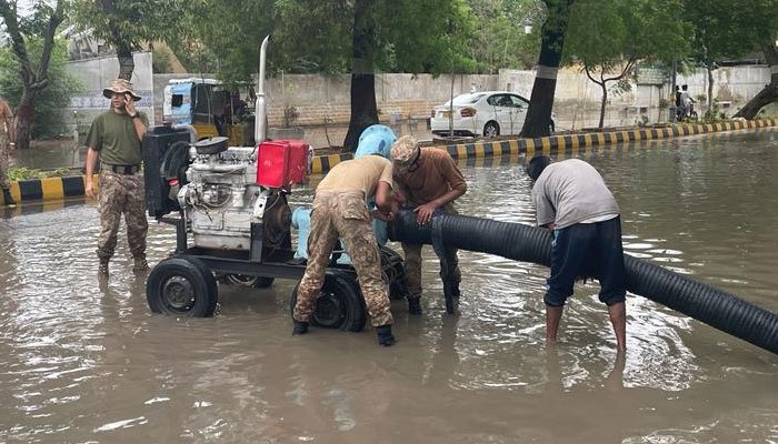 پچھلے چند روز سے جاری بارش کے باعث جگہ جگہ پانی کھڑا ہوگیا، تاہم نکاسی آب کے لیے اب پاک فوج میدان میں آگئی ہے